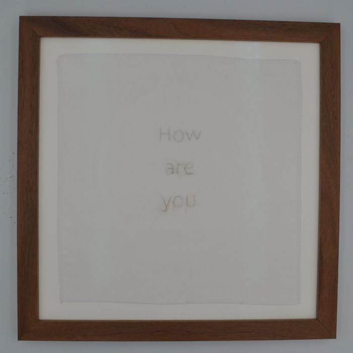 In this pair of embroidered works, gilded human hair — both delicate and enduring — is used to stitch familiar phrases such as “How are you?” and “I am still alive” onto white handkerchiefs. These objects, traditionally associated with sorrow and surrender, become quiet reflections on emotional truth, concealment and survival.