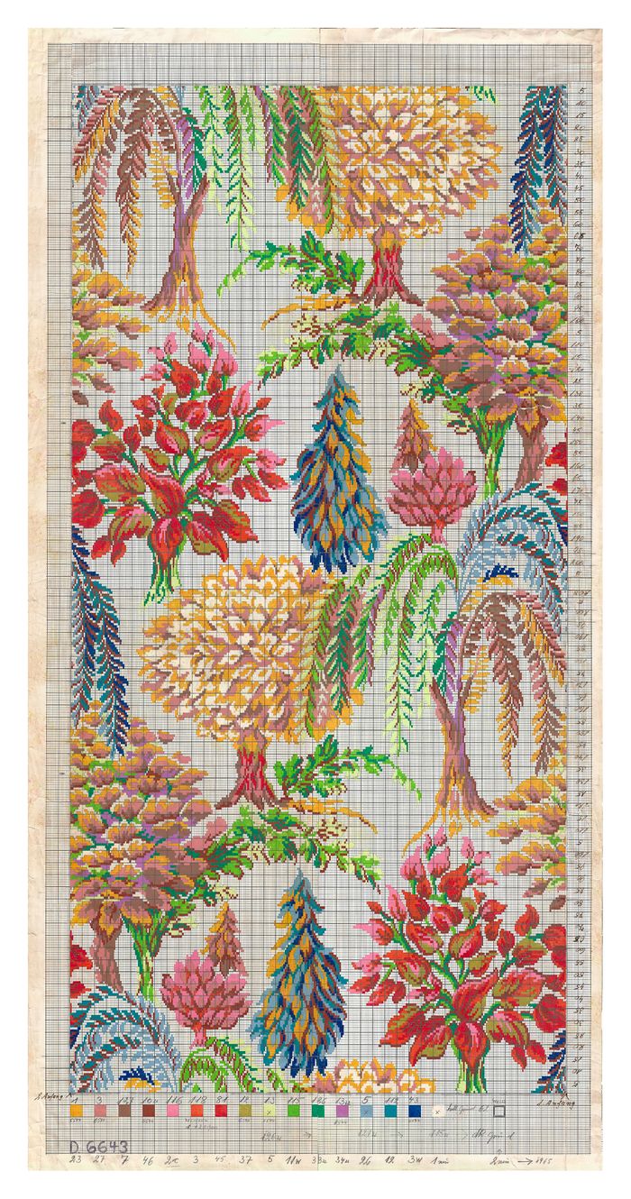 Our limited edition 'enhanced' print has its origins from an original German jacquard textile point paper. The original work drawn in the 1950's was a single half repeat drawning. The point paper was painted with 16 colours that depicted the allocated face weaves to areas of the resulting fabric. The process by which the point paper was read to cut individual perforated loom cards saved painting time. The technicians completed the whole design in two parts Set A and B. The A half repeat was read horizontally weft row by row. Once completed the half design set A was repeated on a repeater cutting machine. The loom cards set of A were then flipped/turned over and set B were sewn/attached to set A. The full repeat of the resulting woven pattern is illustrated on our enhanced life size print. Our art celebrates beautiful art from textile history and the ingenuity of unsung designers working in factories on digital codes in days before CAD and the ease of cut and paste software.