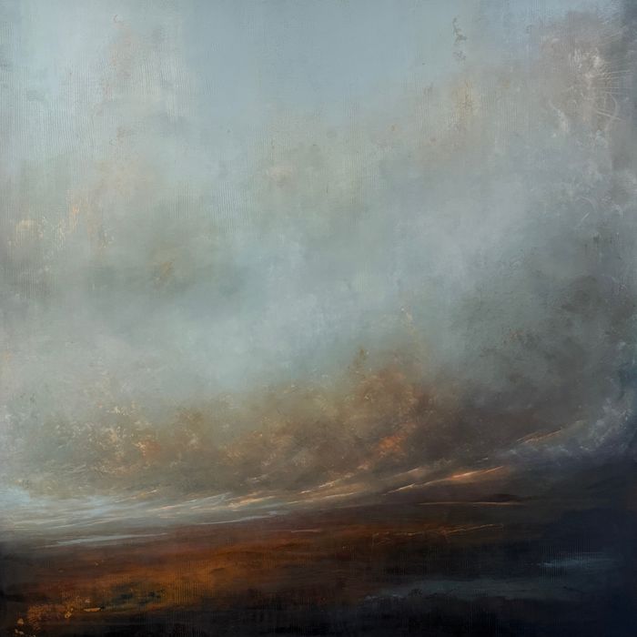 Before the Edge of Wilderness evolved organically after a long period away from the studio, driven by Paula’s need to capture emerging ideas. Vast skies dominate the composition, drawing the viewer into the landscape and evoking the sensation of standing on the moors, watching sunlight glint on clouds above the expansive terrain. Gold leaf catches and reflects the light, enhancing the atmosphere and emphasising the ever-shifting interplay between sky and land.