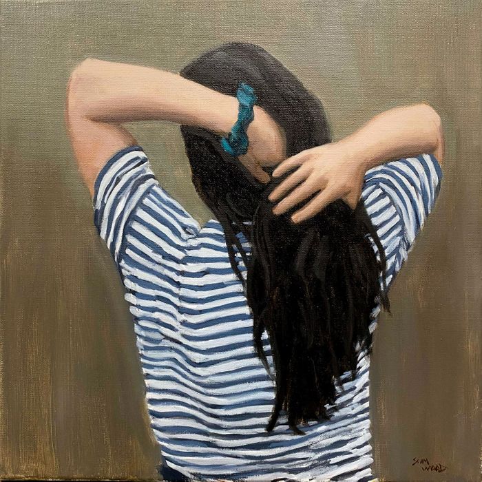 Oil on stretched canvas, 16 x 16 inches, unframed. A quiet, contemplative study of a figure adjusting their hair, where the striped shirt and soft tones.