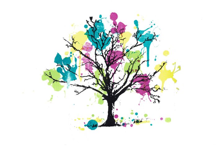A fun, colourful and vibrant illustration of a tree with paint splattered flowers. A strong graphic image with symbolic representation of the tree of life, living a colourful life and having fun.