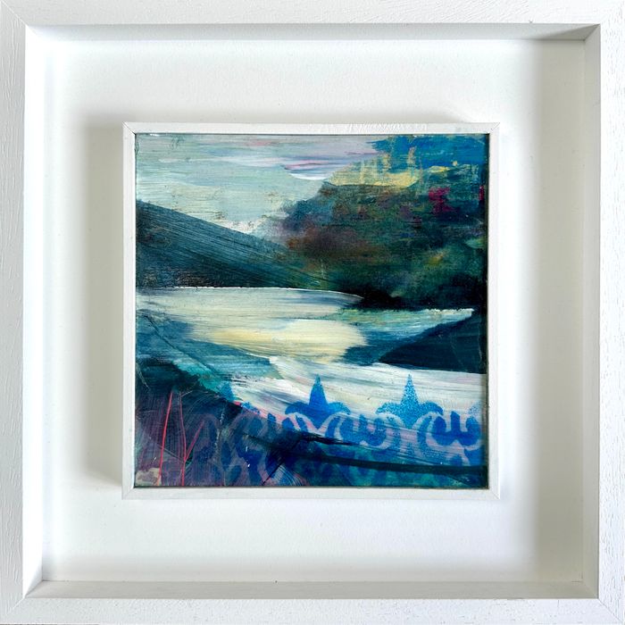 36 x 36 x 3cm. Mixed media. This painting, Blue Lagoon, brings east and west together over a tranquil lake framed by indigo mountains. Light reflects across the water, while abstracted forms create a meditative, suspended space.