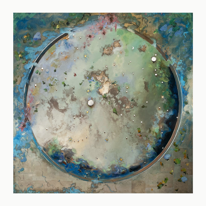 Rivers focuses on silver, tints of white and pale blues to make a subdued, translucent and ghostly image, whose surface appears oily and melting. The stars pop up in high relief through the paint film. This palely shining image has a metallic and almost icy quality.