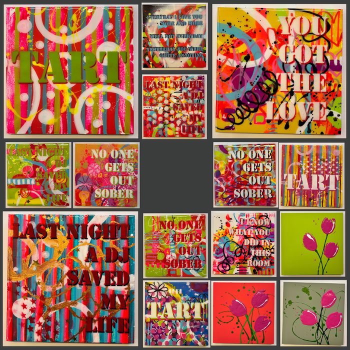 A serries of small 30x30cm wooden blocks featuring bright abstracts and resin caoted and words to make you smile!