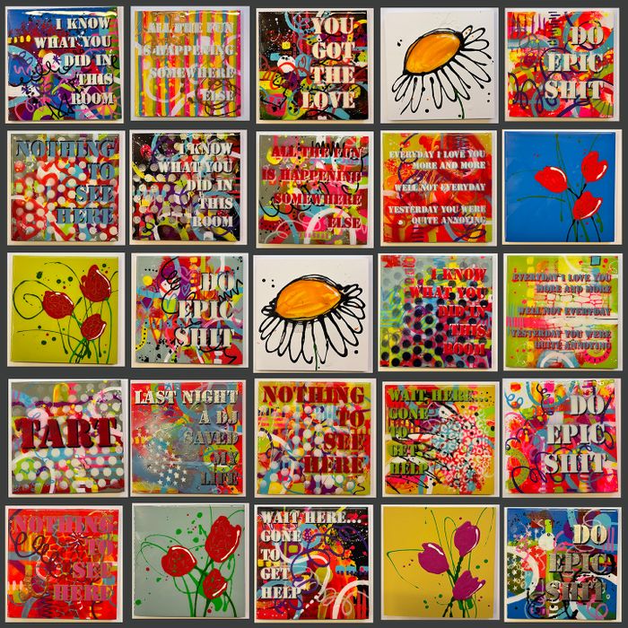 a series of small 30x30cm wooden blocks featuring bold abstracts, resin coated with some words to make you smile!