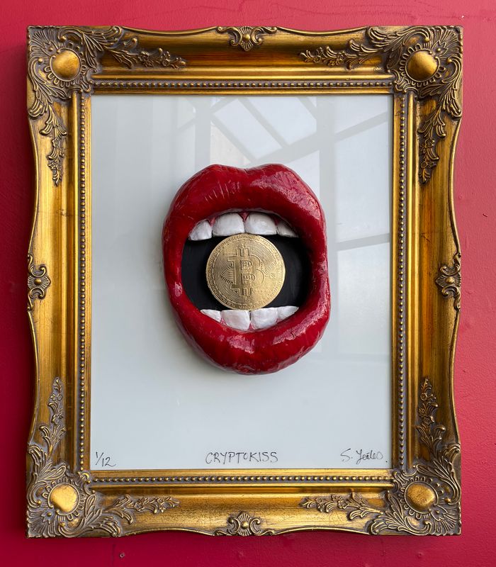 A sculpture of a large lucious pair of lips biting down on a golden comemorative bitcoin. Mounted inside a golden baroque frame.