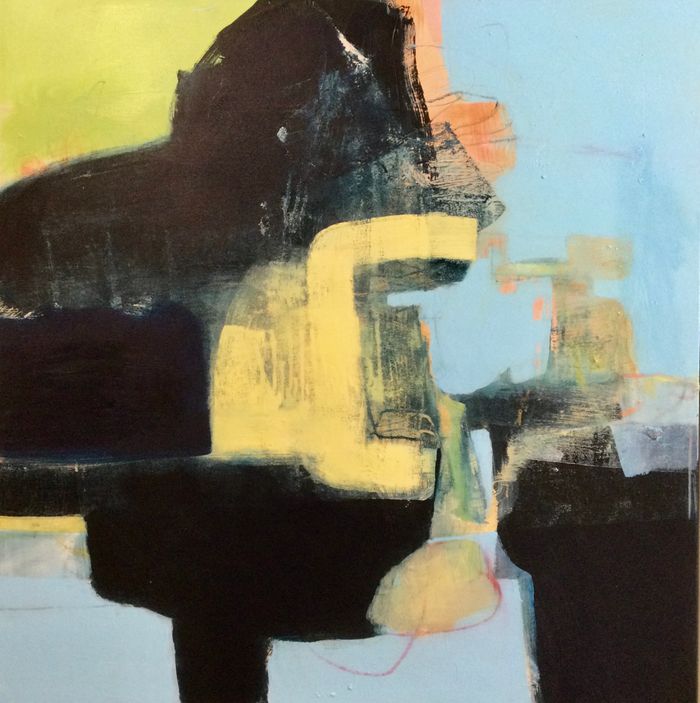 large abstract painting - 1M X 1M - mixed media on canvas framed with a white washed wooden tray frame