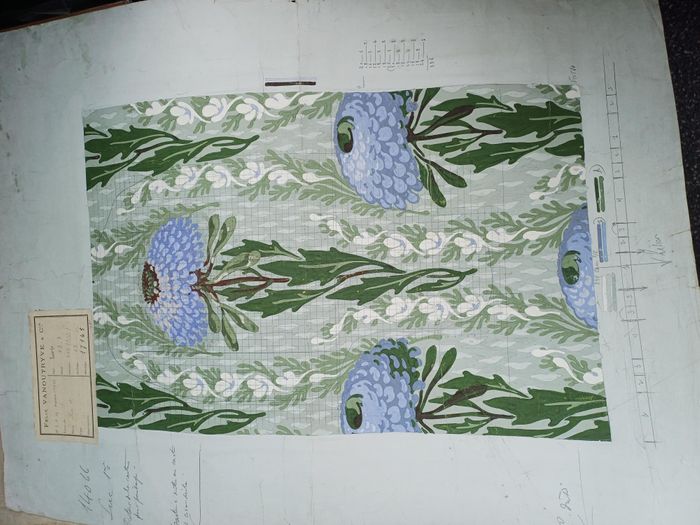 Our Original painting was drawn up for weaver Felix Vanoutryve of Roubaix. The design was commisioned from an unknown design studio. At the time, in 1927 that the production number for the fabric interpretation of this artwork was produced, the Vanouytryve Mill used local studios in Roubaix and Lille but did outsource from design studios in Paris. Often a fabric client sourced or drew the artwork and presented it to the weavers so they would apply the design to a fabric construction. An interesting art history mystery, yet a fabulous celebration of skills in the art and technical abilities of weaving technicians at the time.