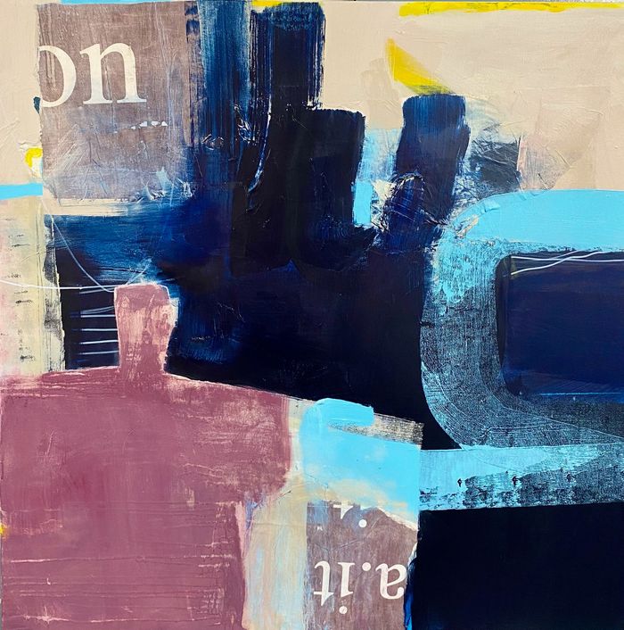 large abstract painting - 1M X 1M - mixed media on canvas in whitewashed wooden tray frame.