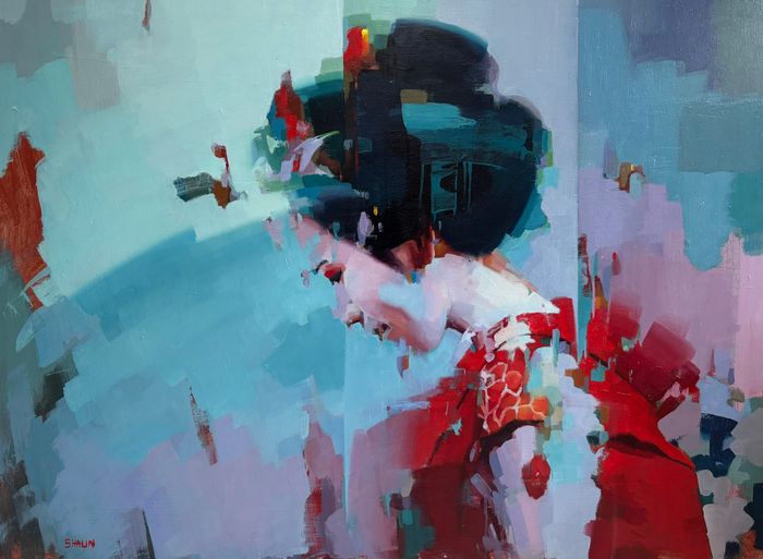 Oil painting on board. Fragmented style abstract figuarative. Presented in a walnut frame. 80 x 110 cm