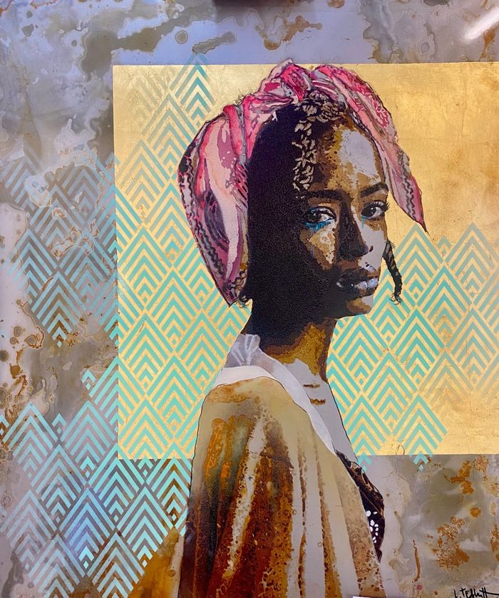 Mixed media on oxidised steel with 24ct platinum gold leaf