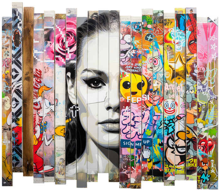 Built from staggered reclaimed timber panels, the surface of each piece appears slightly disjointed a deliberate fragmentation that mirrors the artist’s conceptual lens. Vintage book pages form the underlayer, their yellowed textures peeking through the vibrant overlays of stencilled aerosol portraiture and hand-applied collage taking from original paintings.