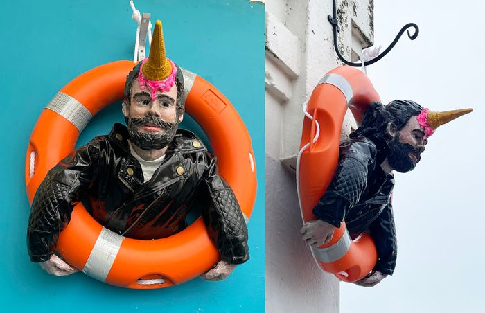 Inspired by a real event my biker wears a real mini leather jacket and cast iceream unicorn horn mounted inside a real lifebouy.