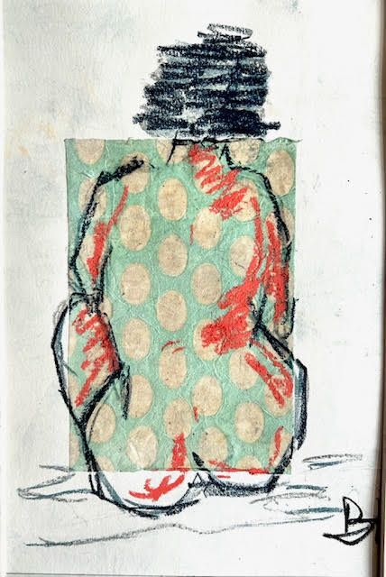 A collaged, mixed media piece.