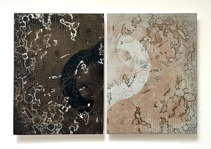 Inspied by celestial and terrestial cartography, Occultation Duo III is made by taking prints from copper plates with a combination of deep etch techniques and automatic, free drawing into grounds. By layering abstract, drawn imagery made with traditional drawing tools and printmaking processes with more abstract painterly marks, the outcomes are a visual fusion of historic and contemporary ideas.
