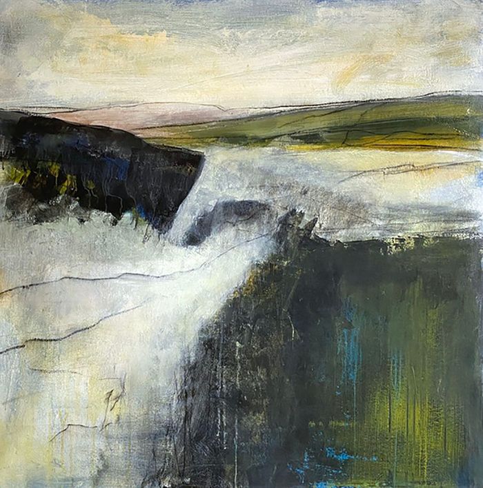 Mixed media abstract landscape painting on canvas. 100 cm by 100 cm. Framed.