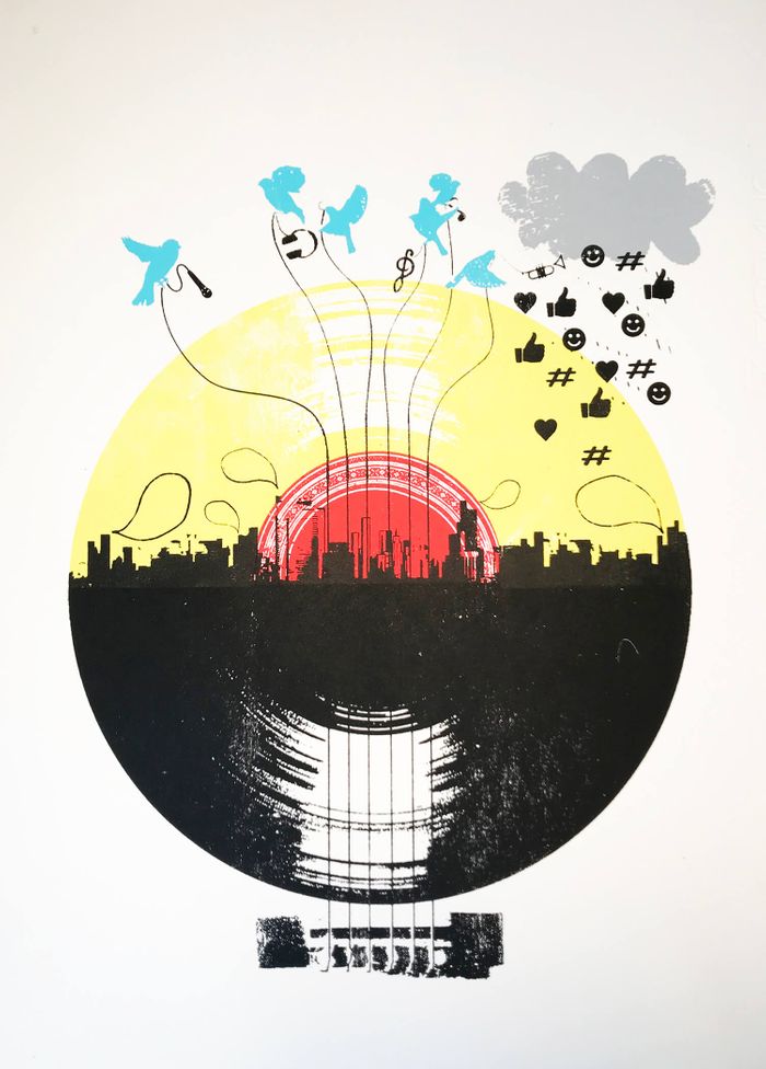 This screen print was commissioned by Listen Music Magazine, representing the impact social networking has on rising to fame in the music industry. The juxtaposition of a city scape within the imagery of the vinyl, with the guitar strings and the twitter birds create a strong graphic image.