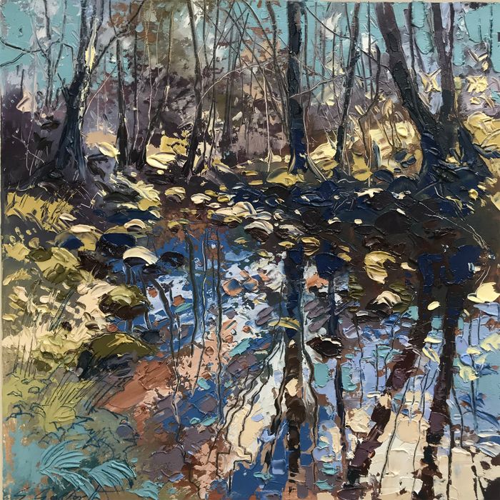 Painted contre jour using mixed media, palette knife, on a cradle board. Image is 40cm x 40cm framed in a wide contemporary white frame to 62cm x 62cm