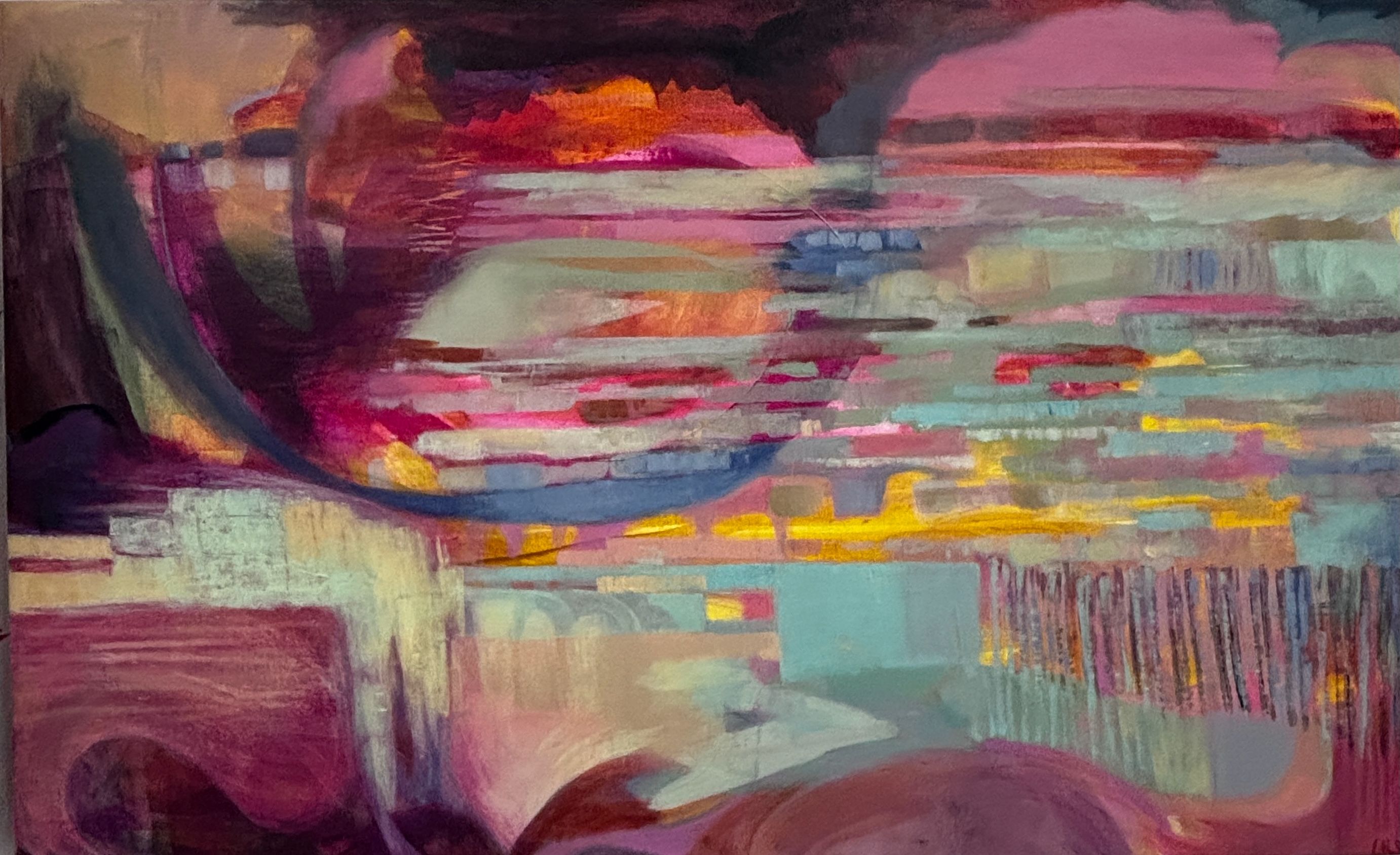 An expressive abstract inspired by evening walks along the Fylde Coast, The work captures the fleeting light and atmosphere as the sun settles down for the night, translating those quiet, reflective moments into colour and movement.