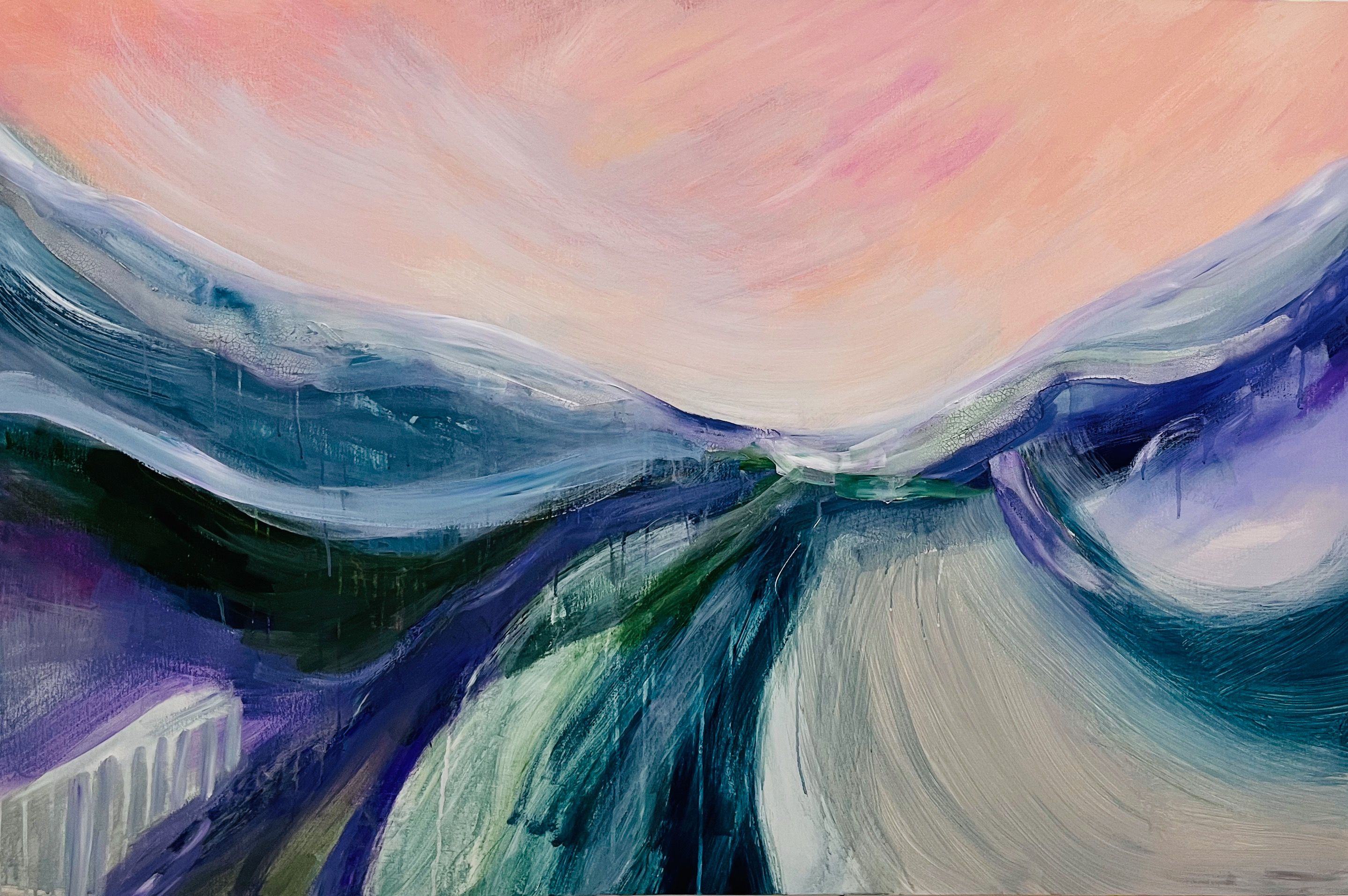 'Transient Glow' is a large abstract atmospheric landscape painting capturing the colours of the sunset in the valley, inspired by shifting light and wild places. Energetic brushmarks, drips, texture and layering of the paint creates an interesting and tranquil statement artwork.