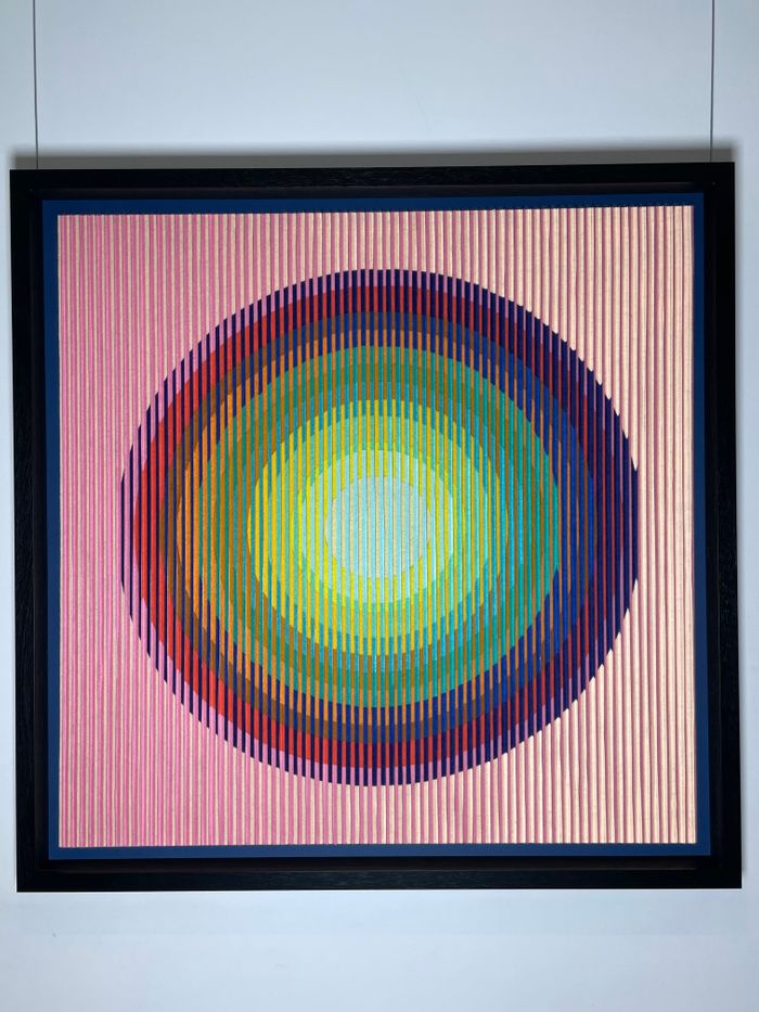 Tropical Sun created in October 2025 is an evolution of the popular Chromatic Sunrise (60 x 60cm). Tropical Sun changes from a set of blues and greens to oranges and reds against pale creamy and dreamy backgrounds. Only 6 to be made and selling fast.