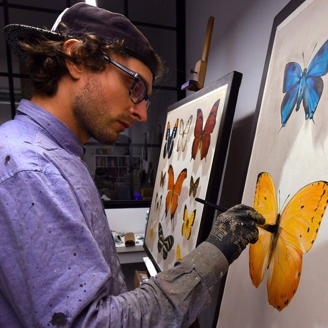 Youri Cansell, also known as Mantra is a consummate artist and naturalist, and is internationally recognised for his large-scale murals of butterfly collections in his usual trompe-l'œil style. While equally adept at painting humans as well as animals, Mantra is especially fascinated by Entomology, the world of insects. Mining memories of his childhood garden in France, he now paints moths and butterflies on canvases and buildings all over the world.