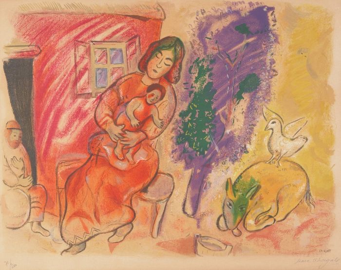 Chagall was born in Russia to a deeply religious Jewish family. During his youth he travelled widely, working in St Petersburg, Moscow, Paris, his native town of Vitebsk, and Berlin. Settling in Paris in 1923, he established a reputation as one of the foremost artists in France. He worked closely with the legendary art dealer Ambroise Vollard, creating three important suites of etchings: illustrations for Gogol's "Dead Souls", prints to accompany the fables of Jean de la Fontaine, and a series of scenes from the Bible. In 1941 he fled Vichy France for the safety of New York, only returning to Europe in 1948.