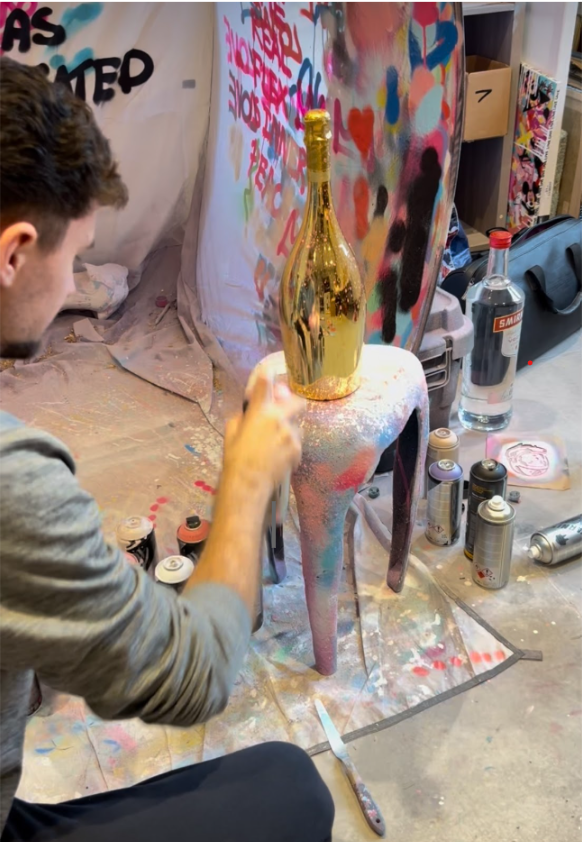 Creating each piece is an adventure in itself. I start with a spark of an idea, which then evolves through sketches and drafts. The real magic happens when I bring out the spray paint, oil paints, and acrylics, layering and blending until the artwork comes alive. It's a process of exploration and experimentation, where the unexpected often leads to the most exciting results.