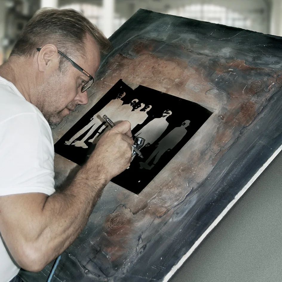 Ellis uses a variety of mediums to create his unique works of art. Plaster, watercolour, sand, acrylic and gouache plus a few secret ingredients all feature in his arsenal. Each is individually hand made, with a custom frame created by him specifically for each piece. His limited edition prints offer an insight into his vast experience as a graphic designer - a two dimensional representation of his original works with each one crafted specifically by Ellis to ensure they offer the same depth of image as the original on which they are based.