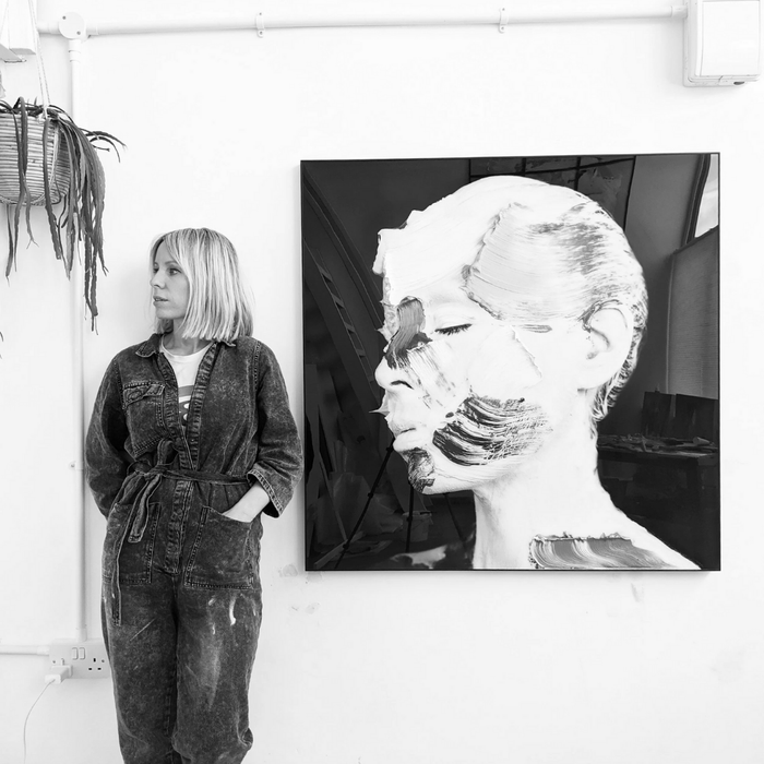 Derrick's innovative practice merges painting, photography, and sculpture. She begins by applying impasto paint directly onto her skin, and then photographs the painted surface. These photographs are subsequently printed and further manipulated with additional layers of paint, creating a dynamic interplay between the painted subject and the photographic image, blurring the boundaries between reality and representation, that question the concept of self and identity.