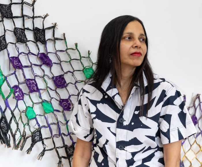 Madi Acharya-Baskerville is an Asian born diaspora artist, living and working in the UK. Broadly speaking, the themes explored in her work range from environmental concerns, migration and exile and gender issues. What unites them is the found element, matter that already exists around us, an enduring reflection of the human condition. Her practice involves the synthesis of unlikely elements which she sources from different locations, the coastline, woodlands and vintage markets. Using objects, textiles, song, conversation, and magazine cuttings which resonate with her on some level, she creates works which move fluidly between different media. Some of the materials have had a past life such as wooden panels previously part of furniture or embroidered textiles which have seen better occasions. Through joyous transformative processes these objects and materials are reborn as part of something new.