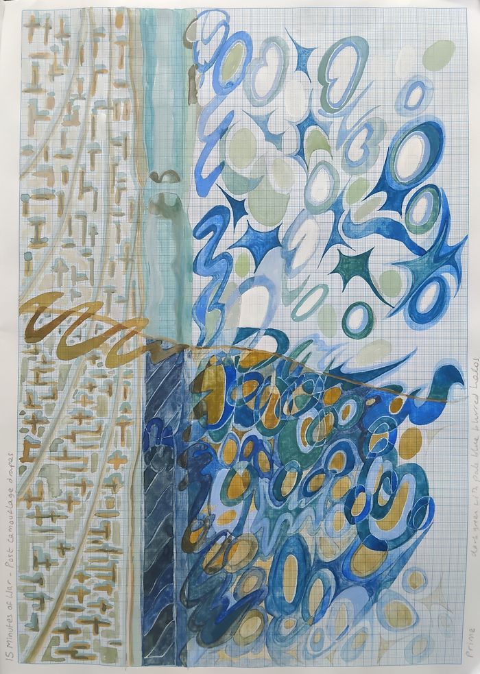 This ongoing series of gouache and pencil drawings on graph paper, begun in 2020, is inspired by being distracted while watching Netflix films and TV series by the dazzling cinematic effects of sparkling lights seen out of apartment windows, sheer curtains blowing in a breeze, trees and shrubs glimpsed out of half open window blinds. I make a line drawing with colour notes in a few seconds flat, as reference. Later I draw out the ensuing design on graph paper and add gouache paint.