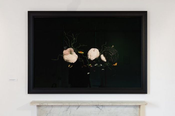 An arrangement of hand sewn velvet brains are presented as a still life. Plastic insects infect the scene and an avocado sits in the background. Inspired by Dutch flower paintings and the surrealist movement the scene depicts my interest in autobiographical artificial displays that presents objects that are simultaneously beautiful and disturbing.