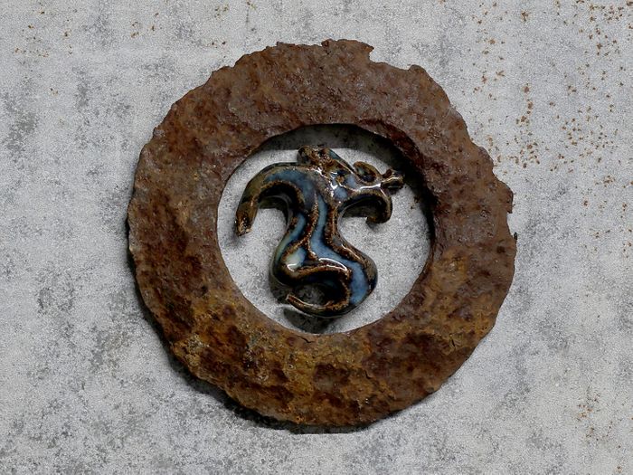 Medium: Ceramic stoneware, found metal. Dimensions: 16 x 16 cm.