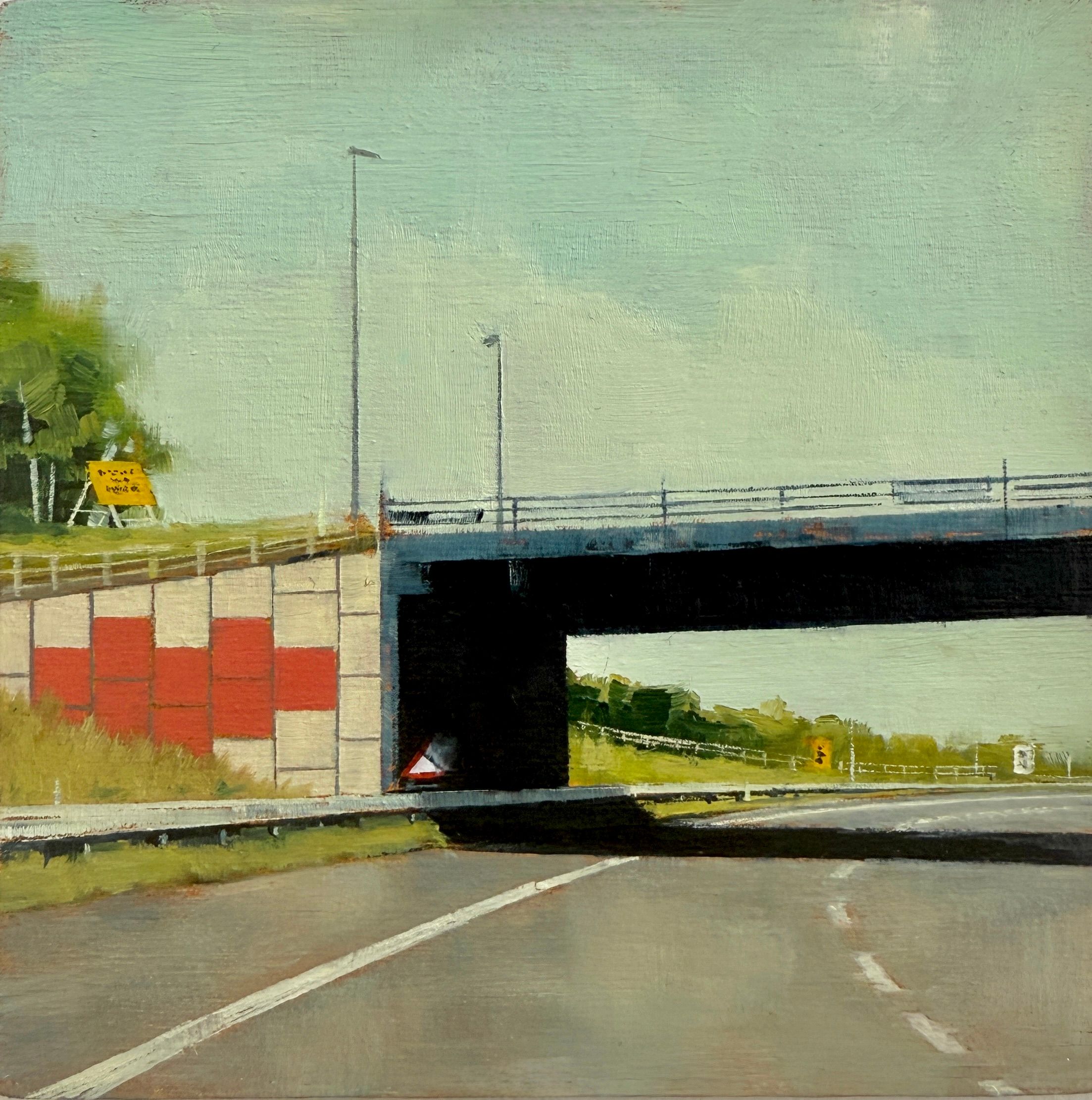 The structures Orpin focuses on, often constructed from concrete and metal are familiar landmarks that straddle well-travelled motorways and roads. The motorway bridge, often unchanged and built to last, offer sturdiness and a consistent presence that spans decades in frequently developed and changing environments. Cars and people are absent from the paintings, shifting the focus to the transport infrastructure, landscape and positioning the viewer as the driver. The subject matter acts metaphorically to emphasise the significance of travel and connection in our lives. The audience are invited to project their memories, journeys and aspirations onto the environments depicted, to reflect on roads as transformative connectors, symbolising opportunities for change and reflection. The paintings also operate as paeans to the aesthetics of both the brutalist design of motorway bridges along with their surrounding landscape and how to render these unexpected attractions in paint.