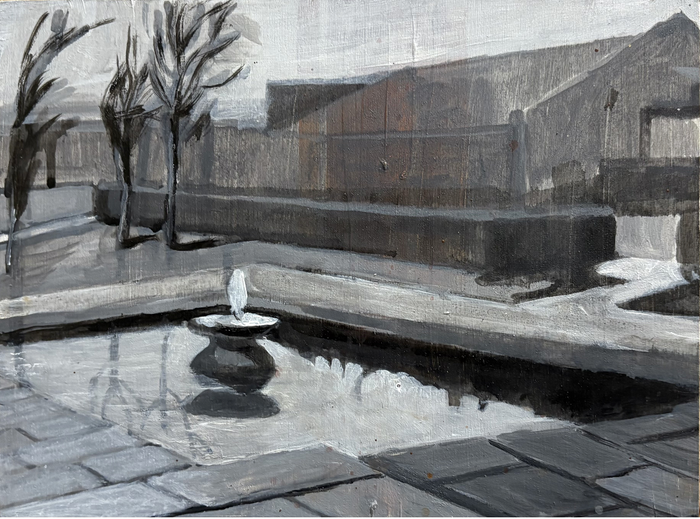 An almost-copy of a zoomed in fragment of an archive photograph of the memorial garden at Guy Motors Co. 1914 - 1982. Many of Guy's workforce were called up and died at war - the garden, part of the works. was a place for remembrance.