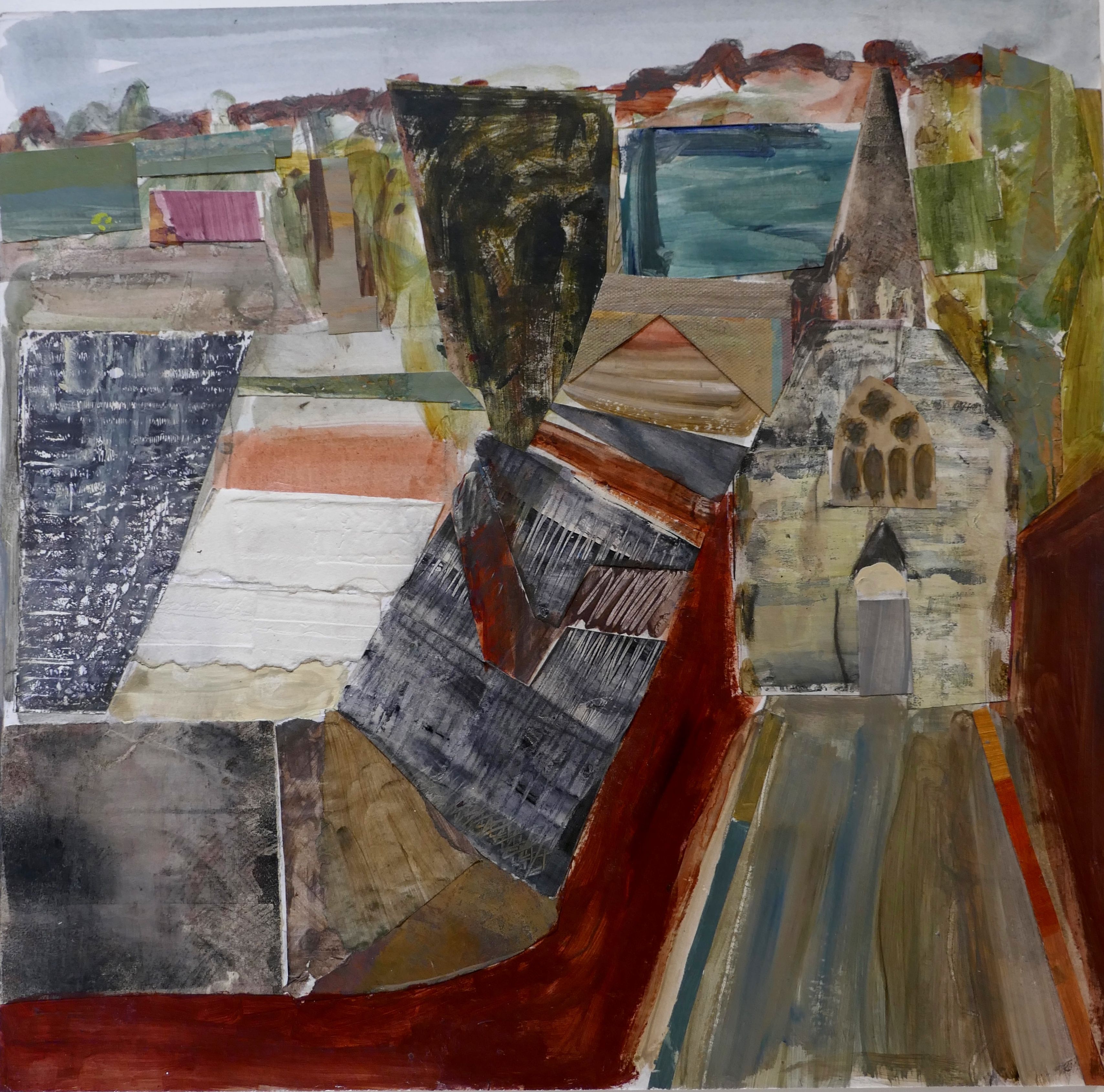 This piece was developed as part of a series that focused on elevated views, captured from the tops of multi-storey car parks. These panoramic perspectives investigate architectural elements through shifting viewpoints, emphasising geometric composition reduced to simplified abstract forms. In her practice Sarah Feinmann is drawn to the overlooked and the mundane, which attracted her to this street scene and the curve of the roof that dominates the painting. She works fluidly between painting and collage, layering collaged media to build rich textural qualities and create a dialogue between material and mark.