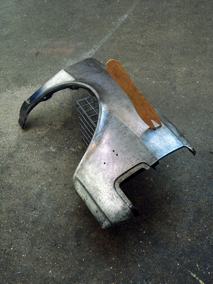 So Long And Thanks For All The Fish is a body panel from a Volvo 340 skewered by an oversize ceramic chip fork. The Volvo 340 was a key antagonist in childhood journeys and has featured prominently in previous work as a personal talisman of Stuart’s experience of holiday journeys.