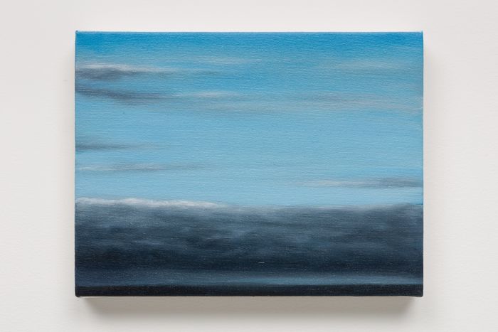 Lisa Milroy’s new series of sky paintings creates fresh possibilities for her exploration of stillness and movement, and expanding the parameters of still life. Her appreciation of blue stems from her birthplace and the distinctive coastal landscape of Vancouver where the mountains, sky and ocean embody three registers of the colour - as a solid, liquid and a manifestation of light and space. Ultramarine blue is a key colour in Milroy’s studio practice, the basis of all her greys and shadows, and used in every single painting she has made since the 1980s. This painting was made in her new studio at Lydd-on-Sea, UK.