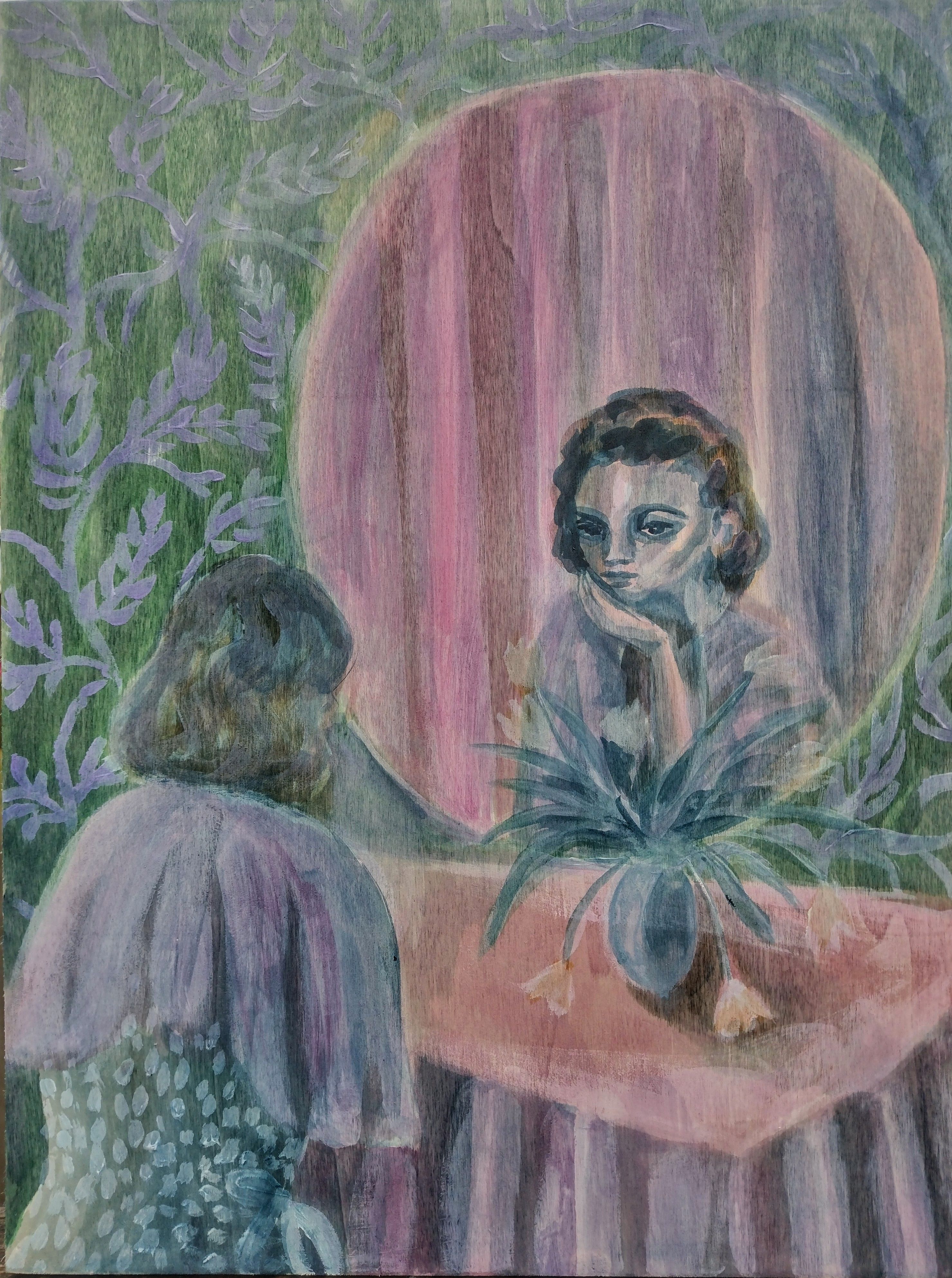 My work draws upon the balance of being an artist mother, for many years exclusively working from home, making paintings that are both intimately familiar and claustraphobically uncanny, set in domestic or decorated interiors. The imagery in "Tulips" is inspired by vintage craft manuals on homemaking, fashion magazines and old Hollywood dressing room photos. The use of specific colours and patterns is important, derived from these references and nod towards perceived notions of femininity, nostalgia and taste. I use white acrylic paint as a primer in certain compositional parts only, laying down patterns and certain details, and then work with acrylic inks, letting them seep and saturate into those unprimed parts of the wooden surface. The affect is quite loose in areas, giving the somewhat vintage inspired work a more contemporary reading, but this layering of inky paint also suggests watercolor painting and the tropes of femininity and domesticity that this medium historically dictates. My work has always been concerned with imagery that is slightly off kilter, exaggerated or fabricated, deliberately saturated or starkly lit, producing contrived and manufactured environments which are oddly dreamlike and static, which is the case with "Tulips".The use of the reflection in the mirror, the doubling or twinning of the figure further heightens this feeling of the uncanny and a somewhat voyeuristic presence. I regard my works as being a still from a story or film, caught up in a moment, the image paused; sometimes melodramatic, sometimes fragments of quiet and uneasy tension.